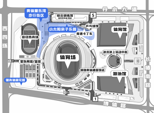奧體童樂(lè)灣步行街區(qū)西鄰田徑訓(xùn)練場(chǎng),適合開(kāi)展足球、慢跑、飛盤(pán)等親子運(yùn)動(dòng),南側(cè)配備有“奧體便民共享便利店”和衛(wèi)生間,向東可直達(dá)體育場(chǎng)二層平臺(tái)的“小太陽(yáng)”網(wǎng)紅打卡地,不僅視野開(kāi)闊,能一覽各場(chǎng)館建筑風(fēng)貌,還配備了攀爬架、沙坑、秋千等兒童玩樂(lè)項(xiàng)目。