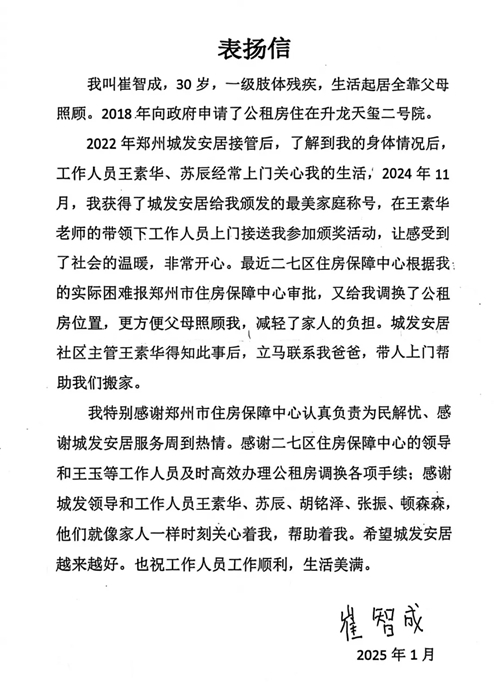 1月9日清晨,崔老師一家分別向住保中心、城發(fā)安居贈(zèng)送了錦旗,并送來一封表揚(yáng)信,對(duì)住保中心所展現(xiàn)的認(rèn)真負(fù)責(zé)態(tài)度以及為民解憂的卓越作風(fēng)表達(dá)了高度贊揚(yáng),同時(shí)也對(duì)城發(fā)安居工作給予了肯定鼓勵(lì)。